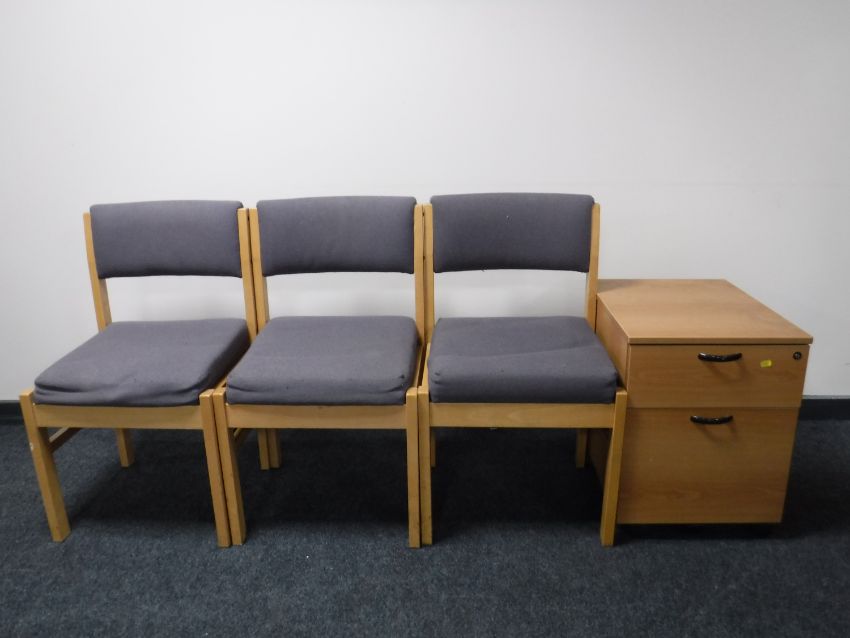 A two drawer beech chest and three chairs