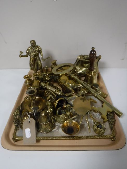 A tray of large brass key, brass boot ornament, brass figures, etc