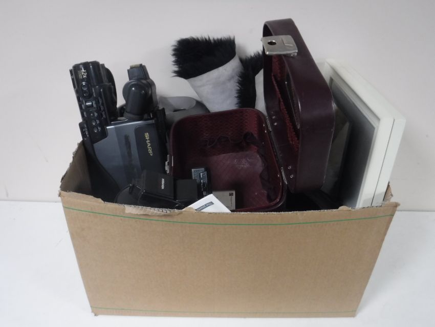 A box of books, jewellery casket, camera, Sharp video camera, pictures etc