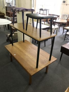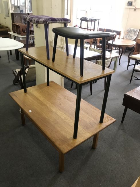 An oak low table, pair of stools and metal based long table
