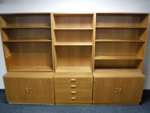 A mid twentieth century light oak three part bookcase, fitted with drawers and cupboards beneath