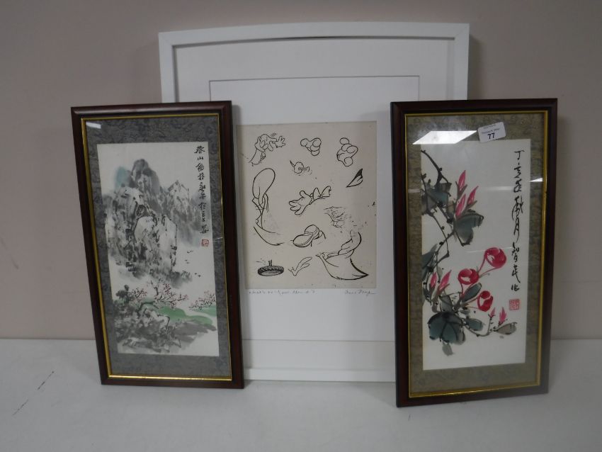 A pair of Japanese watercolours together with a monochrome prints indistinctly signed in pencil. (3)