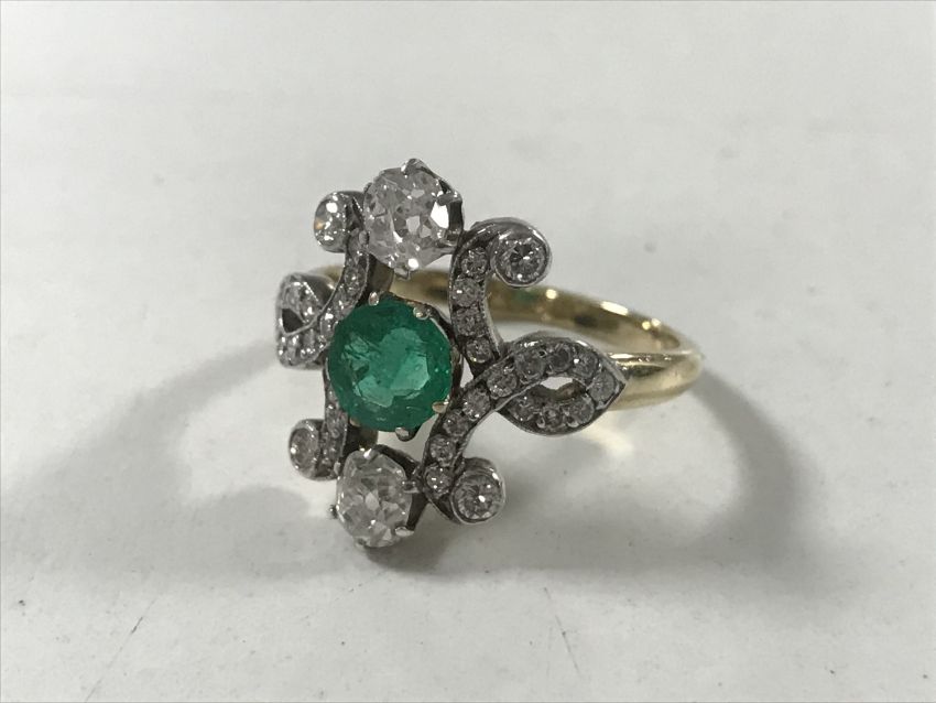 The ring is in good condition. It weighs 3.3g. The shank is unmarked but tests as 18ct. The two principal old-cut diamonds each measures approximately 4.20mm in diameter. The diamonds are approximately VS1/VS2 clarity and I/J colour. The emerald has some slight internal flaws when viewed under magnification but presents well to the naked eye. It measures 5.83mm by 5.65mm. The emerald is very slightly loose in its setting, the claws require tightening.