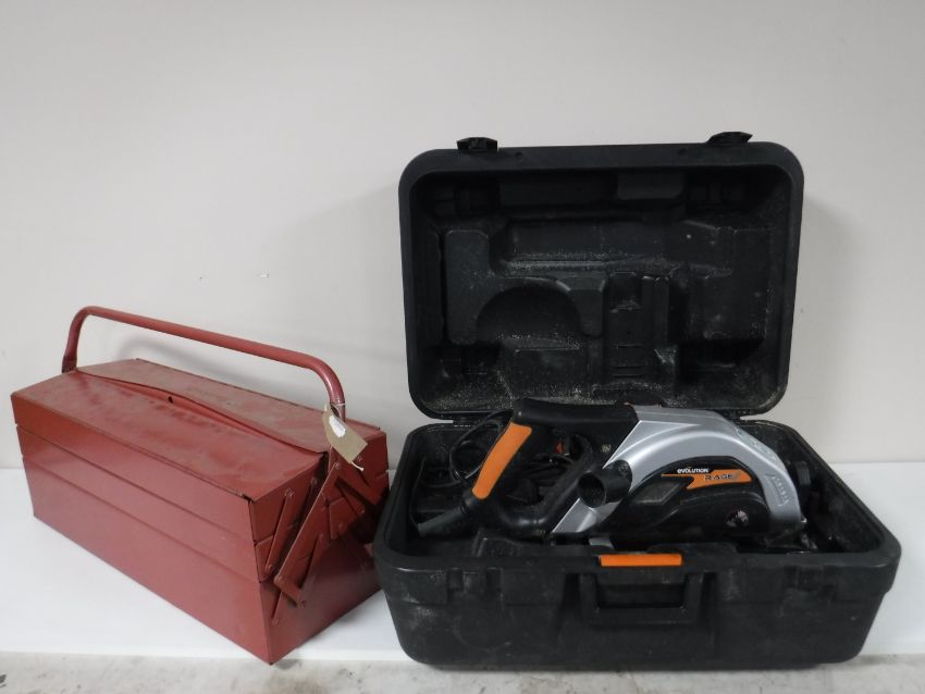 A concertina metal tool box together with hammer drill, angle grinder etc