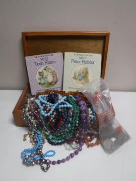 A wooden box of costume jewellery, beads, necklaces, etc, together with an assortment of coins and children's books