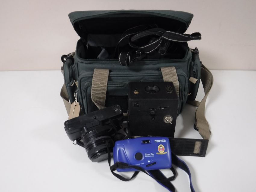 A camera bag containing a Praktica BX20 camera, lenses, flash, etc