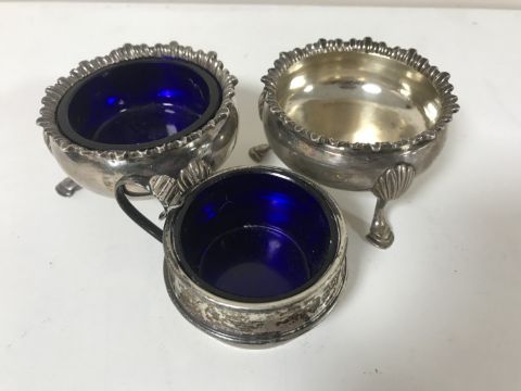 A pair of Georgian silver salts together with one further silver salt with blue glass liner