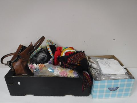Two boxes containing bags, hats, lacework, table linen etc