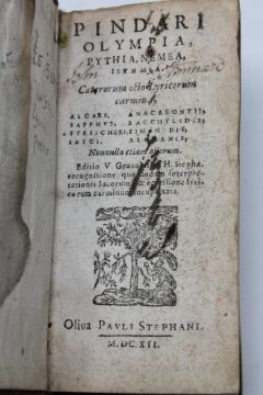 Pindar, First Olympian Ode, publisher Oliva Pavli Stephani, 1612, bound in vellum