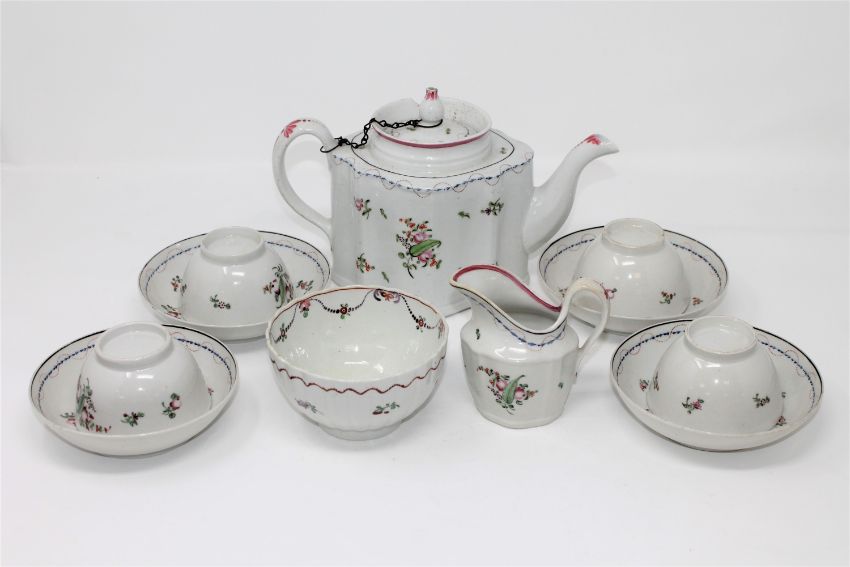 Chip to rim of teapot (thumbnail sized), security chain present on lid, spout un-damaged, puce mark N208, milk jug slight time-staining otherwise good, sugar with general discolouration but in good order, one teabowl with hairline crack, saucers in fair condition.