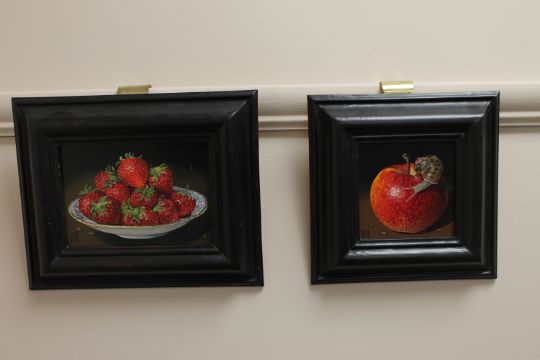 Susan Hearson S.B.A. (British Contemporary), still life of a snail on an apple, together with a still life of strawberries in a bowl, oil on board, both signed, 9cm by 9cm and 14cm by 9cm respectively. (2)