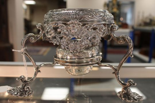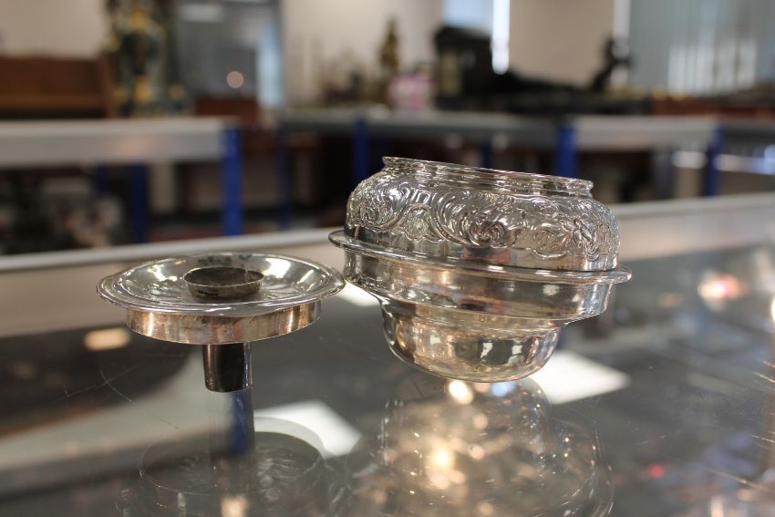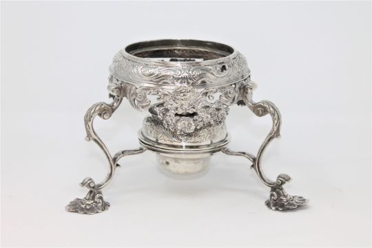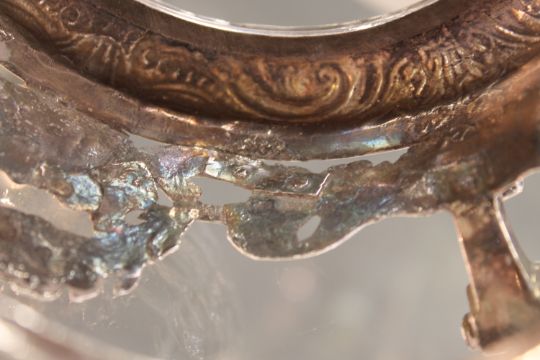 Rim of burner slightly bent. Several possible old repairs to the underside, sections have rivets overlapping them. Height 12.5cm. See images.