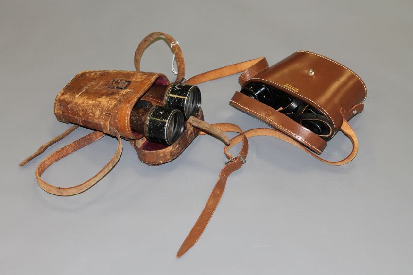 A pair of WWI military issue binoculars in leather case, together with a further case set of Yashica binoculars. (2)