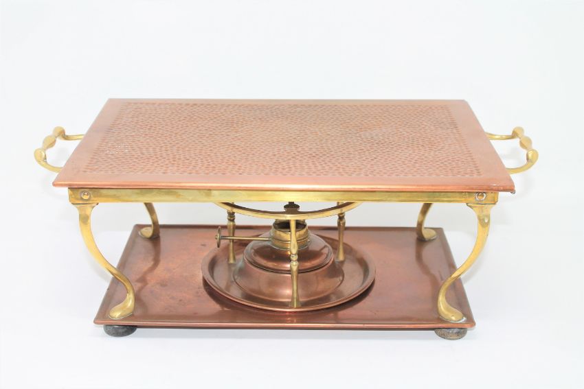 A late 19th century copper and brass food warming tray, width 43cm.