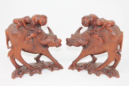 A pair of early 20th century Burmese carved hardwood figures of water buffalo, with riders, height 22cm. (2)