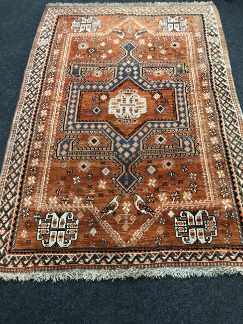 A Persian rug, a large central geometric medallion upon a brick ground, surrounded by flower heads and songbirds, 244cm by 166cm.