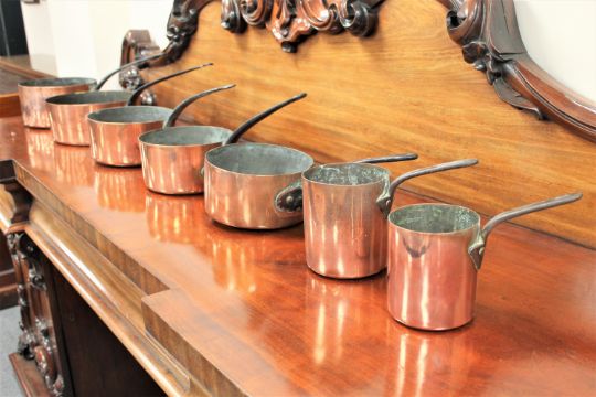 A good set of seven Victorian graduated copper pans with cast iron handles, the largest 53cm in length. (7)