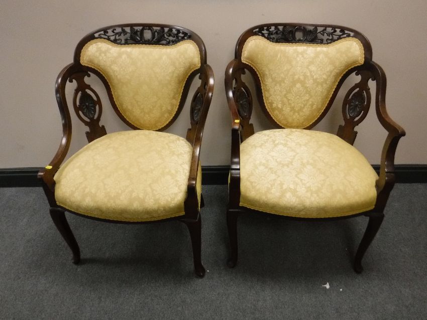 A pair of carved mahogany armchairs in gold upholstery, width 60cm.