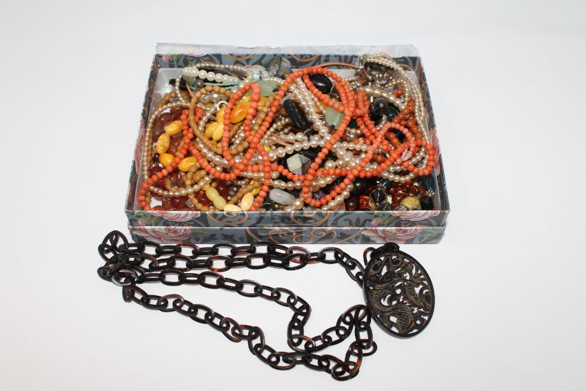 A nineteenth century tortoise shell necklace and pendant, together with various beaded necklaces