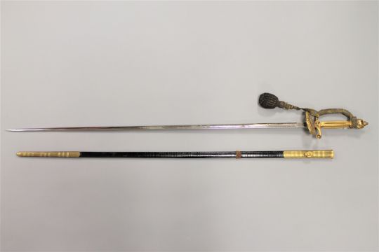 A George V court sword, with 81cm steel blade and brass mounted leather scabbard.