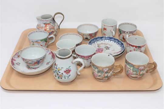 One teacup with several minor chips to rim. Another teacup with a hairline crack. Another with several minor chips to the rim and a hairline crack. Three tea bowls all with chips to rim and hairline cracks. One saucer with minor chips to rim. One milk jug with replacement wicker handle. Other pieces are in good condition.