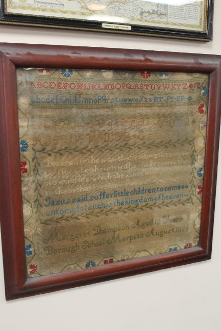 A Victorian alphabet sampler, by Margaret Thompson Aged 12 years, Borough School Morpeth, August 1859, 50cm by 48cm.