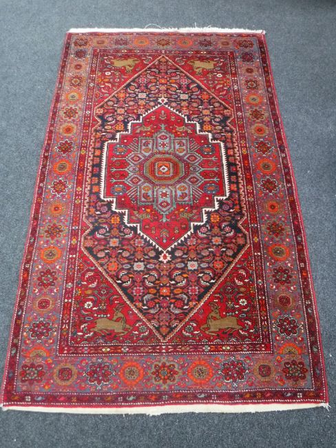 A Persian rug, with a central stepped medallion upon a midnight blue field of serrated leaves, enclosed by a blue flower head border, 224cm by 130cm.