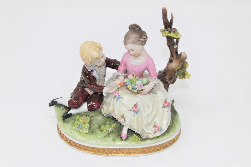A Capodimonte porcelain figure of a girl and boy seated on a tree branch, height 13cm.