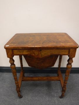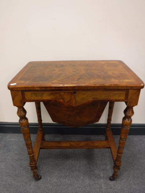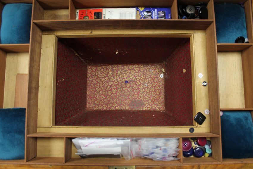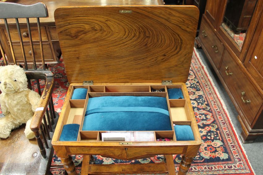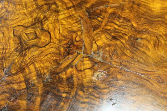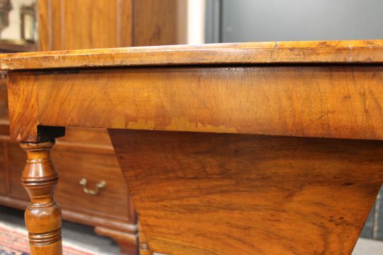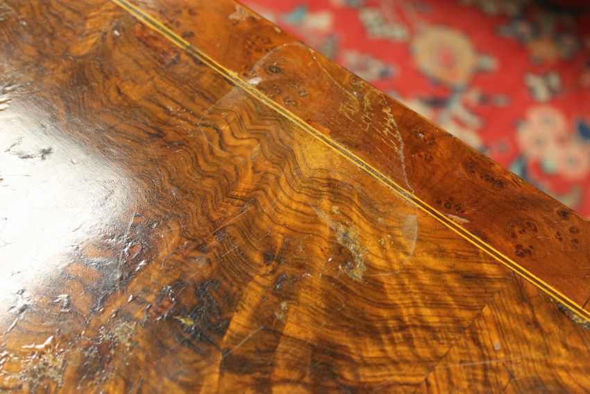 Top with bubbling and lifting veneer. Some missing sections of veneer have been filled and stained. Frame rather wobbly. Interior good. See additional images.