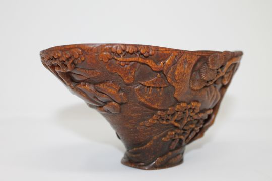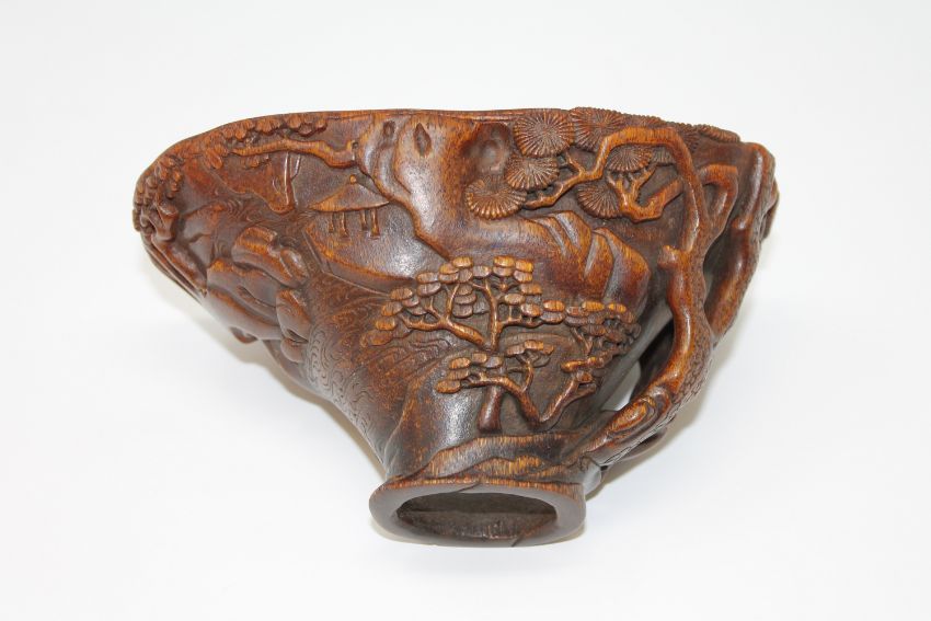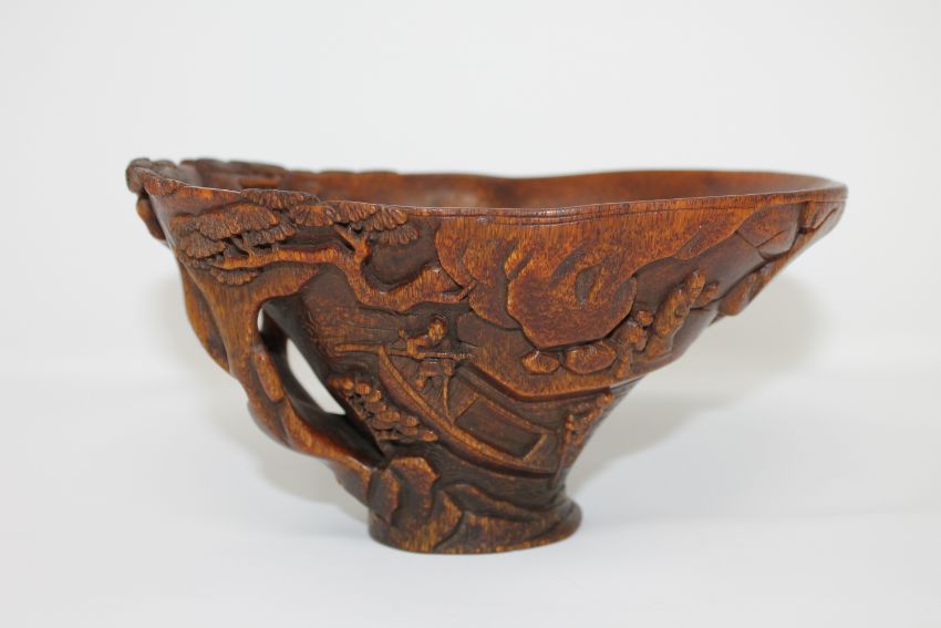 A Chinese carved rhinoceros horn libation cup, late Qing period, of warm-toffee tone, the vessel finely carved externally in relief with pine trees upon a mountainous landscape with figures steering a boat along a flowing river, the handle formed from a gnarly pine tree trunk and a rocky outcrop, the tree branches spilling over the rim and into the bowl, upon a flared, oval foot, good colour and patination, darkening towards the foot, measuring 153mm by 94mm across and 83mm in height, 232.7g. CONDITION REPORT: Professional independant opinion : Carved rhino horn libation cup weight 232.7g 153mm x 94mm at the widest point of the cup, and 83mm high.This is the horn of an Asiatic rhino. I can establish this as it is carved from the full horn and therefore gives an indication of form and shape. The horn is darker and heavier in colour than that of the black or White rhino. The colour is also more uniformed and has a reddish and golden tone when held to the light, which is more common with the Asiatic rhino. The horn is full and has no hollow core which is found in buffalo horn etc. Looking at the base, I can see the pitting commonly found at the root of the rhino horn. The fibres are long and straight which is also indicative of rhino horn. I would estimate the date of the rhino horn to be around 1880. My reason for this is the patina, which has built up in a finer layer than those of later periods. There is some cracking and crazing to the horn, which is found when horn dries out slowly. The amount of crazing on any one area would indicate to me that it dates from the aforementioned period. Also, it is noted that it has been carved in China, and the decoration is of a fine quality. Given the history provided in the clients affidavit to the Auction house, along with the quality of the hand carving, this would also suggest that it dates from circa 1880.