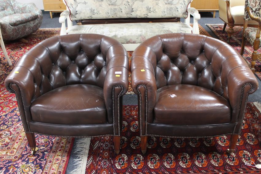 A pair of early 20th century brown Chesterfield style club armchairs, on tapered mahogany legs raised on brass castors, width 77cm. (2)