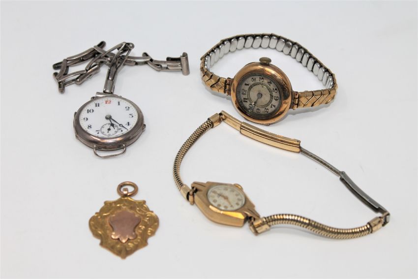 A 9ct gold fob, 4.1g, together with three vintage wrist watches. (4)