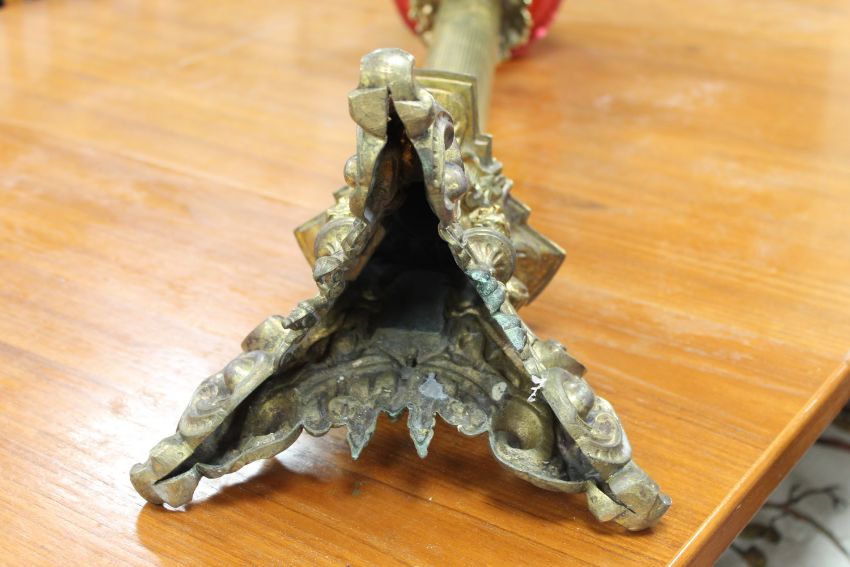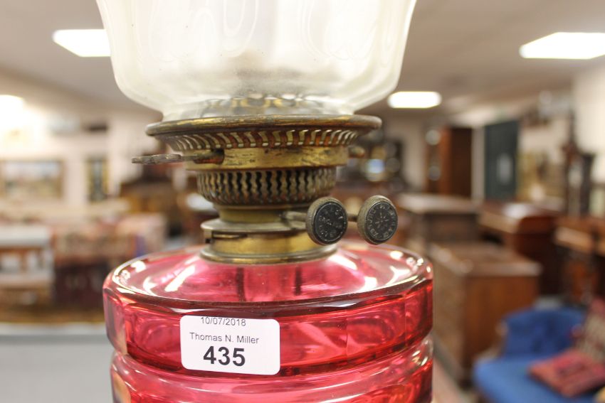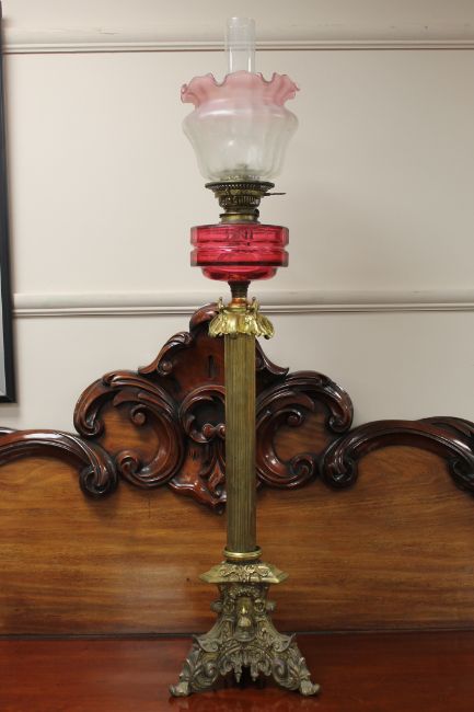 An impressive Victorian brass oil lamp with pink glass shade, height 109cm.