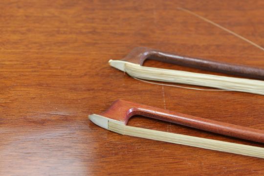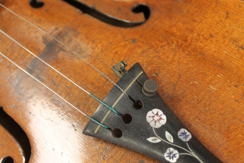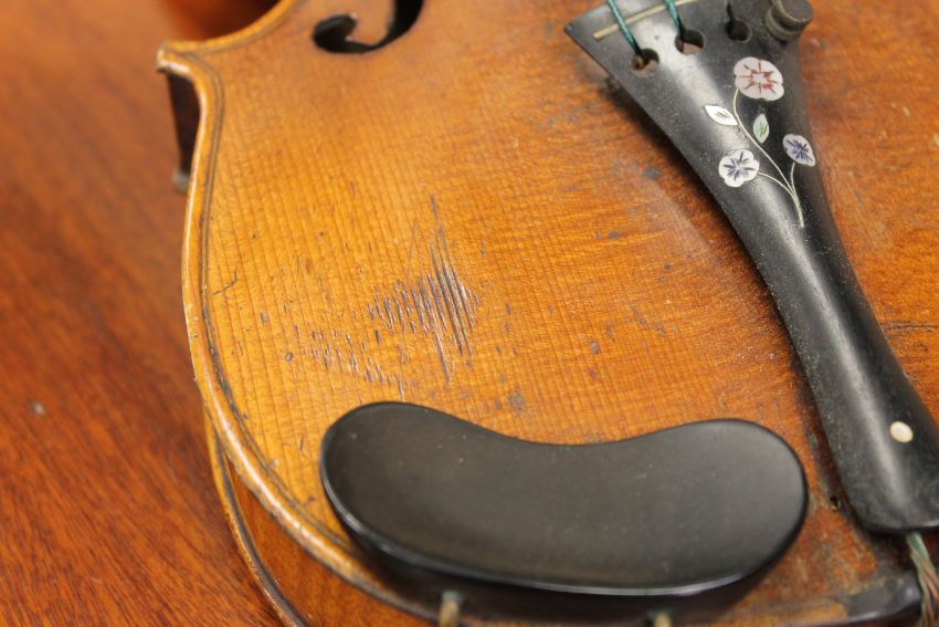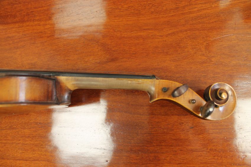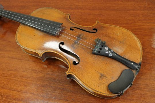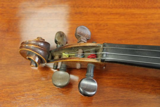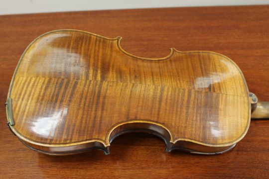 A late nineteenth / early twentieth century violin, back length 13.75 inches, with two bows of a later period.