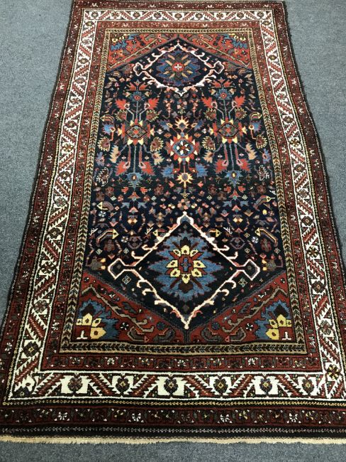 A Persian rug, with a central blue medallion of stylized flowers, enclosed by cream borders, 254 cm x 142 cm.
