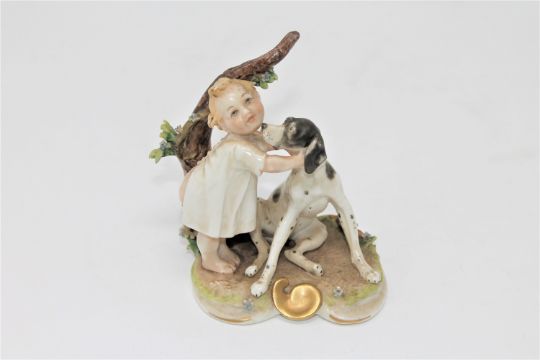 A Capodimonte porcelain figure of a baby and dog, height 9cm.