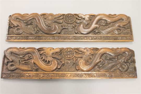 A pair of late 19th century Chinese carved wooden panels depicting dragons, length 91cm.