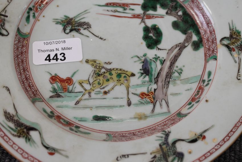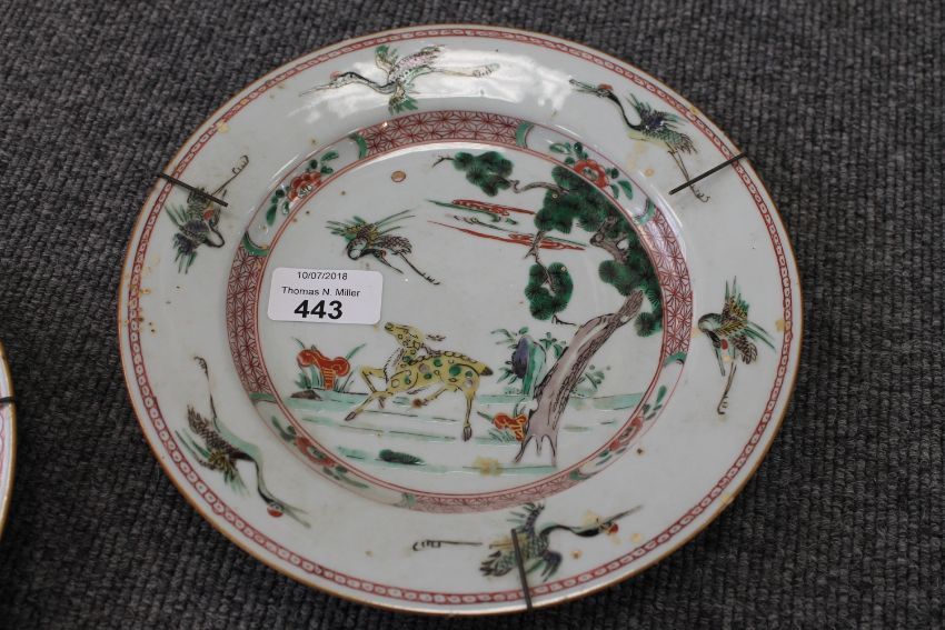 A pair of Chinese 18th century cabinet plates, decorated with flora and fauna, diameter 22 cm. (2)