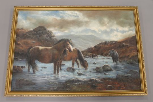 John Trickett (b.1953), Highland ponies watering, oil on canvas, signed, 90cm by 60cm.