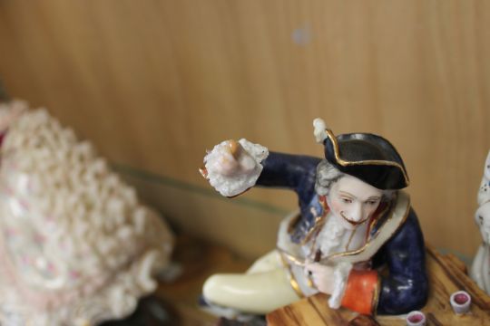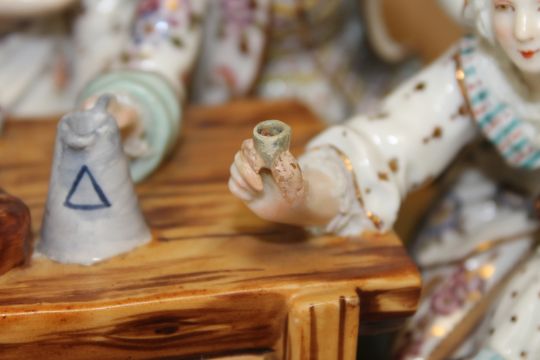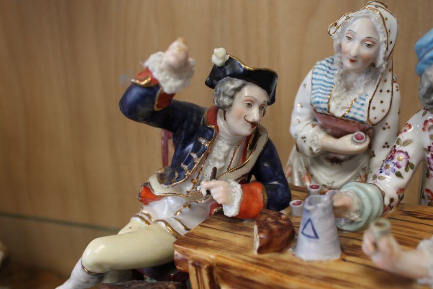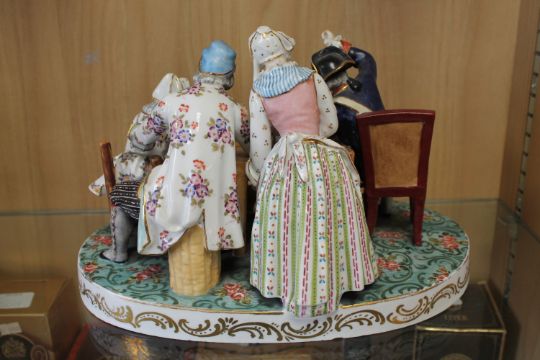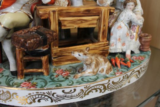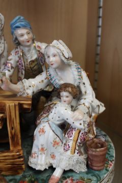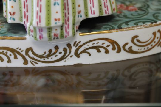 Chip to rim of base on reverse edge. Loss to gentleman's fingers. Lady's hand appears to be restored, as does the pail to her left. See additional images.