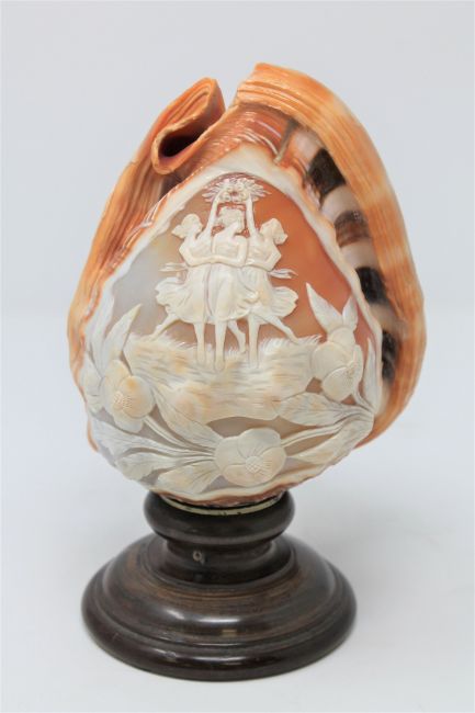 A Victorian carved cameo conch shell depicting The Three Graces, on turned wooden base, height 20.5cm.