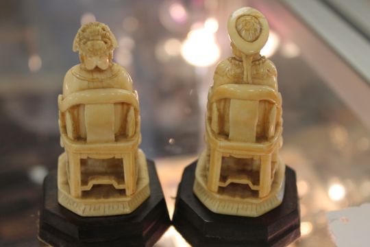 The Emperor weighs 84g. The Empress is glued firmly to the hardwood base and therefore cannot be weighed separately. There are some natural cracks to both figures but overall these are in good condition. See additional images. Height excluding bases 8cm.