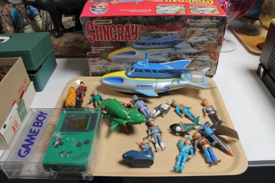 A tray of matchbox Stingray action submarine, together with Stingray and Thunderbird action figures, Matchbox diecast thunderbird II, colour Game boy in case
