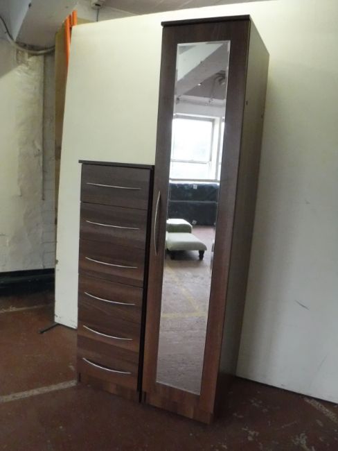 A mirrored storage cabinet together with matching six drawer chest