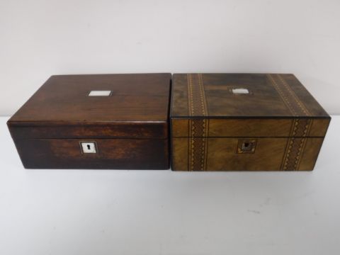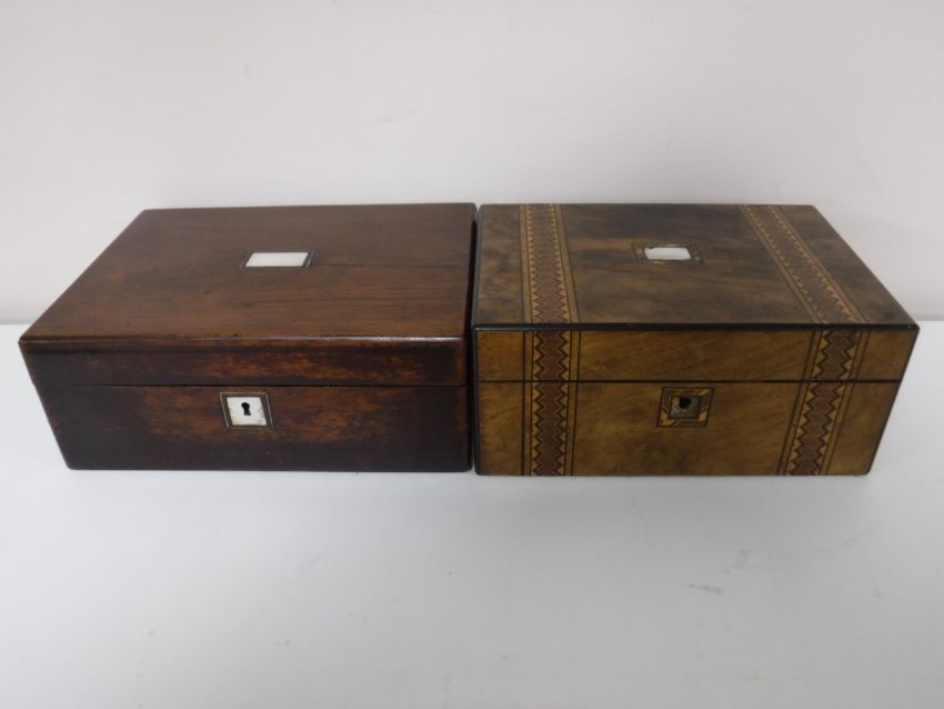 A Victorian inlaid walnut jewellery box and a Victorian rosewood jewellery box CONDITION REPORT: First box - 28cm by 20cm by 12cm.Second - 30cm by 22cm by 12cm.