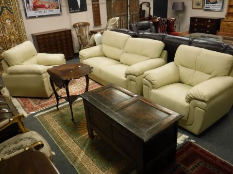 A cream leather three piece lounge suite comprising of two seater settee and pair of armchairs (brand new)