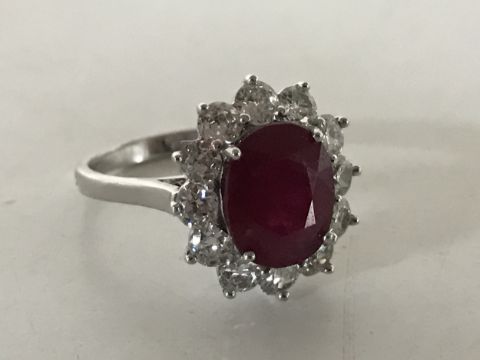 An 18ct white gold ruby and diamond cluster ring, size L.