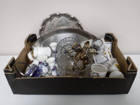 A box of assorted glass ware, commemorative mugs, antique china dressing table set etc