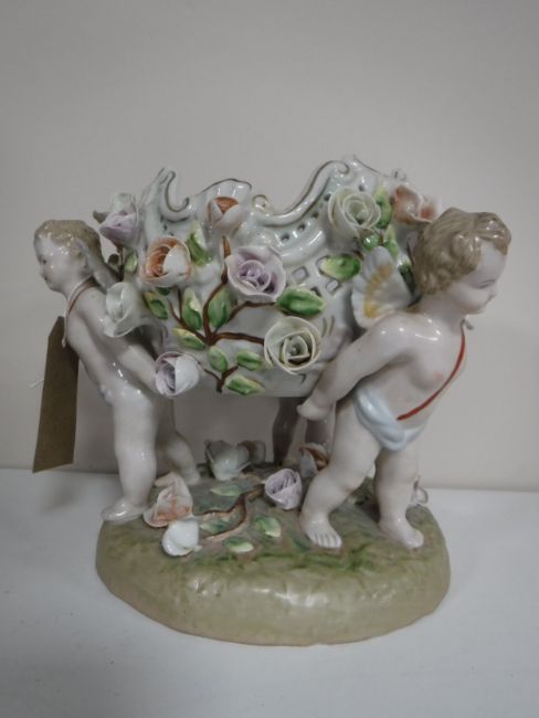 A continental bowl with flower decoration surmounted on three cherubs, blue crossed swords mark to base