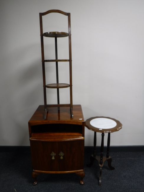 A walnut Queen Anne style bedside cabinet, plant stand and three tier cake stand